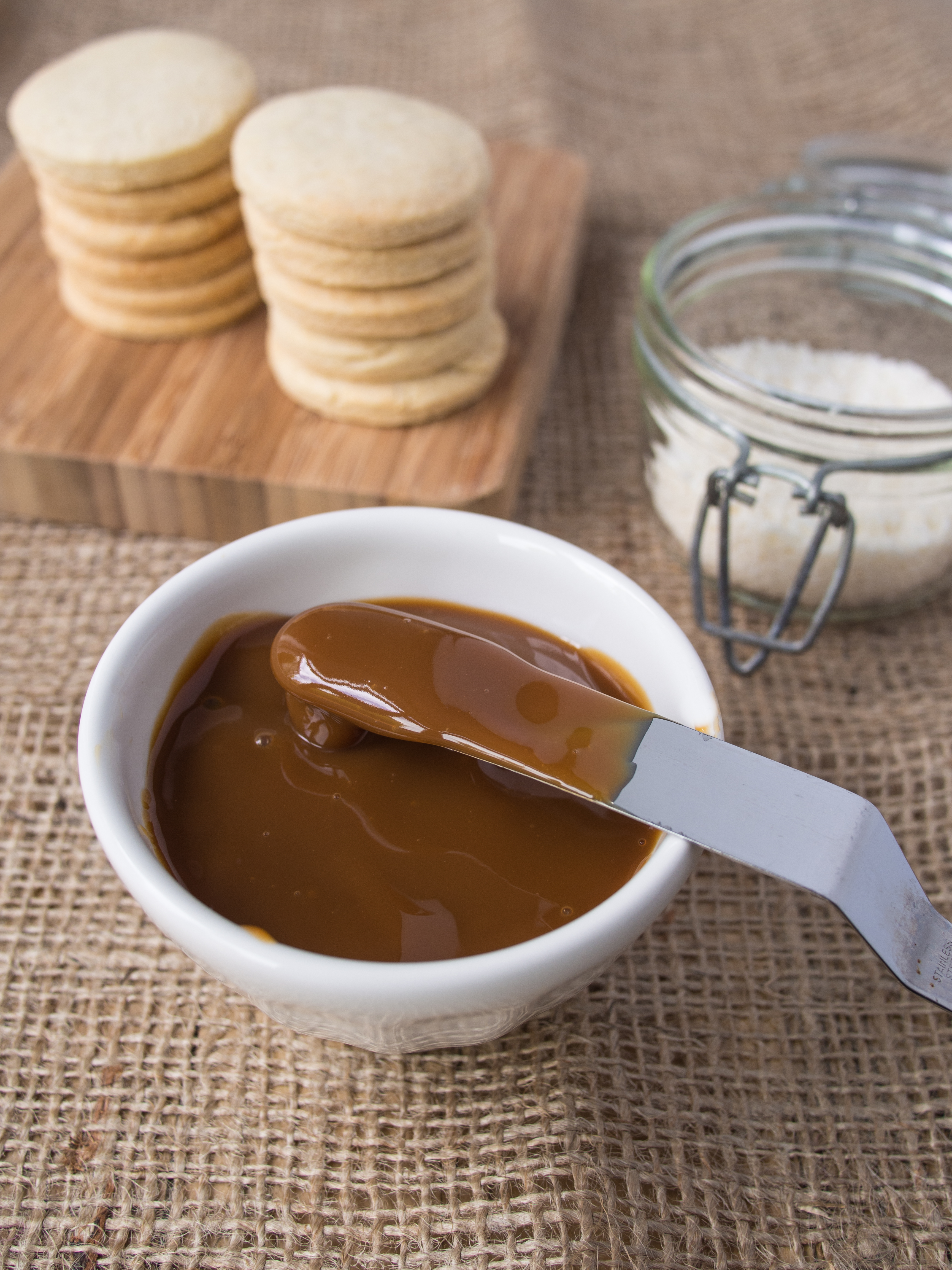 Pronounced Al-fa-ho-res, these little biscuits melt in the mouth thanks to the cornflour in the biscuit dough. Traditionally, these biscuits are round in shape and most recipes I researched called for a 2 inch plain or fluted round cutter but you could use any small cutters. I cheated and bought Bonne Maman Confiture de Caramel rather than making my own dulce de leche but it was quite runny and tricky to sandwich the biscuits together so I won’t short cut again!