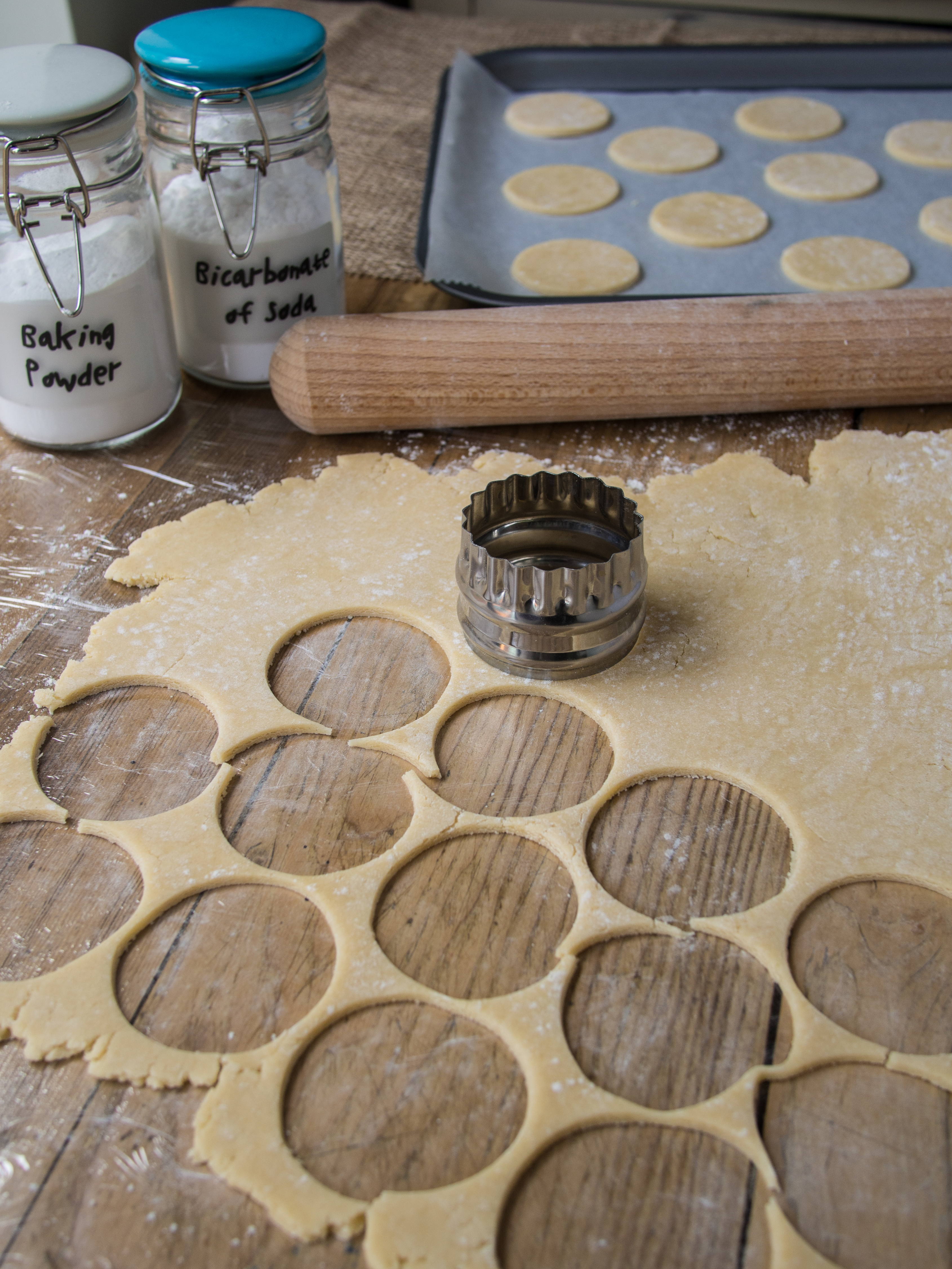 Remove the chilled dough and unwrap half of it onto a lightly floured surface and roll out to a thickness of approx 3-4mm or 1/4 inch. Replace the unused dough back in the fridge. Cut out 20-25 rounds (if you are using a 2 inch cutter), rerolling until all of the dough has been used. Repeat with the other half of the chilled dough.