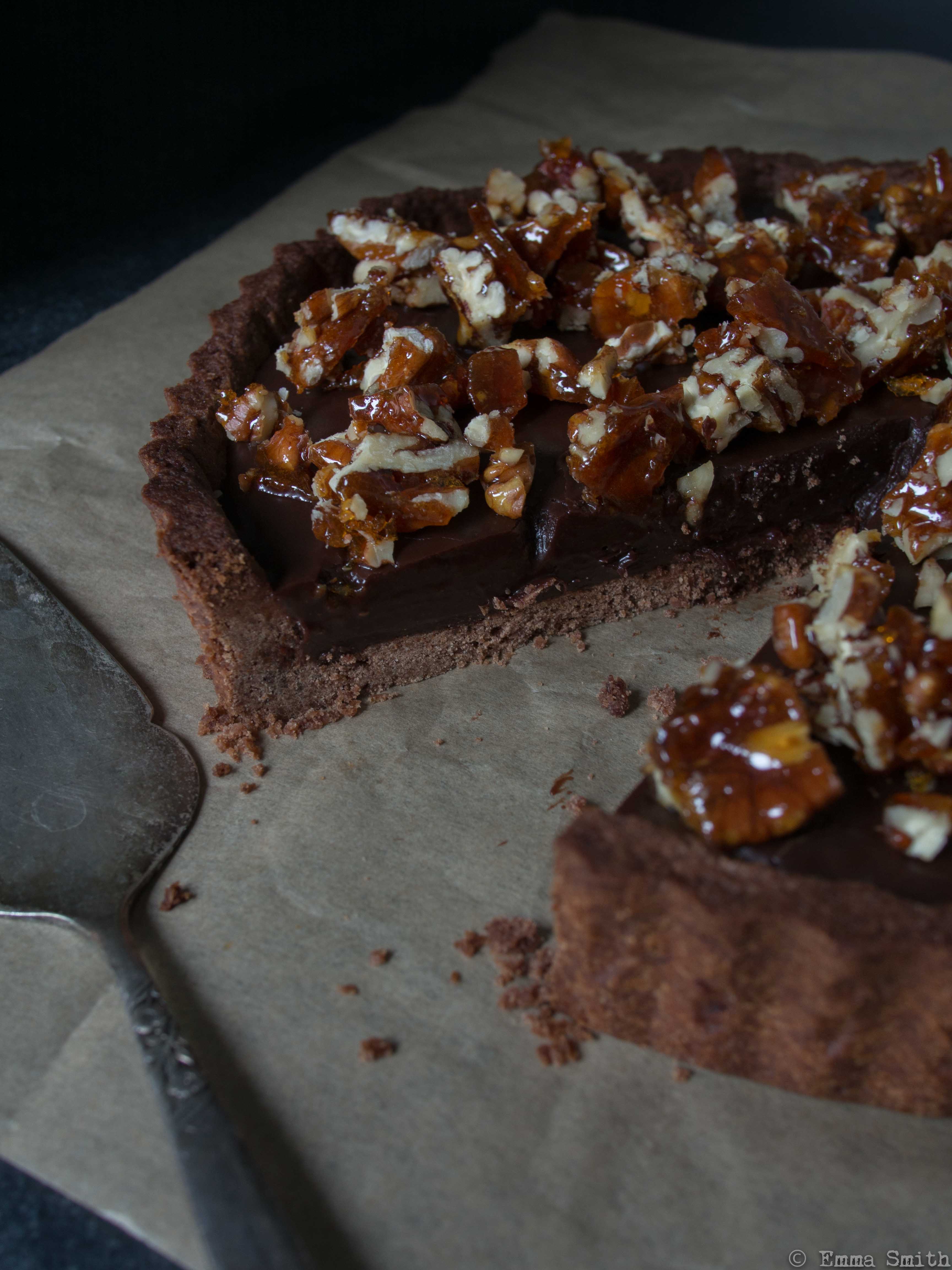 For the crunchy topping, heat the sugar in a heavy bottomed saucepan, Stirling until you have a golden liquid caramel. Add the salt and mix well. Sprinkle in the pecans and quickly pour the mixture onto a sheet of parchment and spread out with a spoon or spatula. Allow to cool then chop up and scatter over the tart.