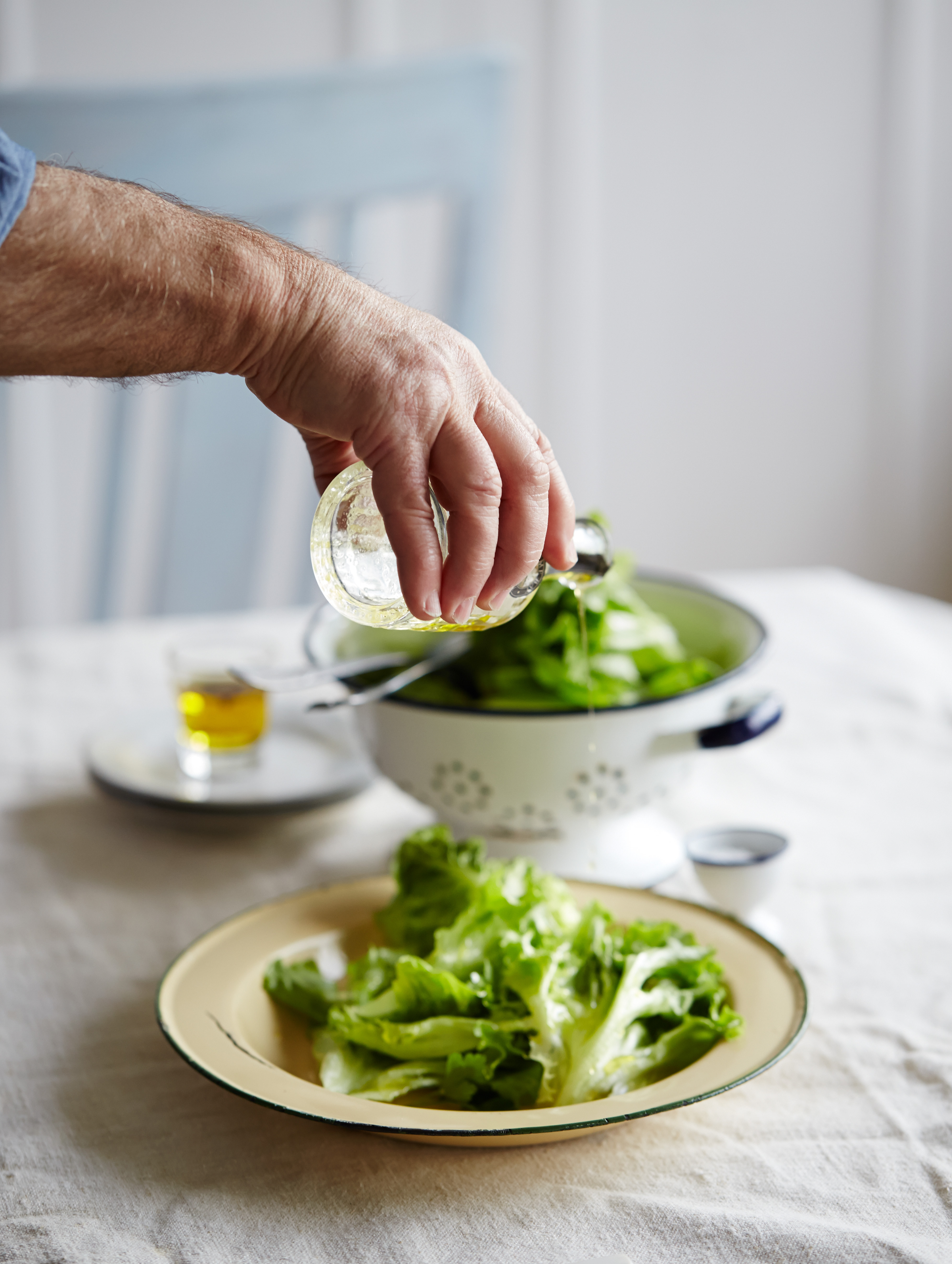 After a delicious lunch of chicken and chorizo casserole, bountiful sides, pungent cheese and chat of escapee snails making a bid for freedom from Roger’s stock pot we went back to work looking at set up shots using only diffused natural light, exploring side and back lighting on subjects such as boiled eggs and lush salad leaves.  We had the run of Sam’s gorgeous props and backgrounds and had great fun working in pairs to create the set ups.