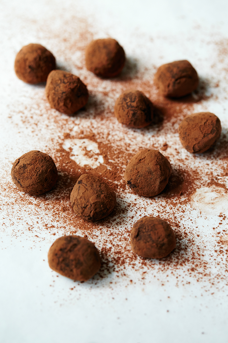 Take teaspoons of the truffle mixture and roll into balls. Drop into the cocoa bowl and roll to coat then transfer to a baking sheet lined with parchment.