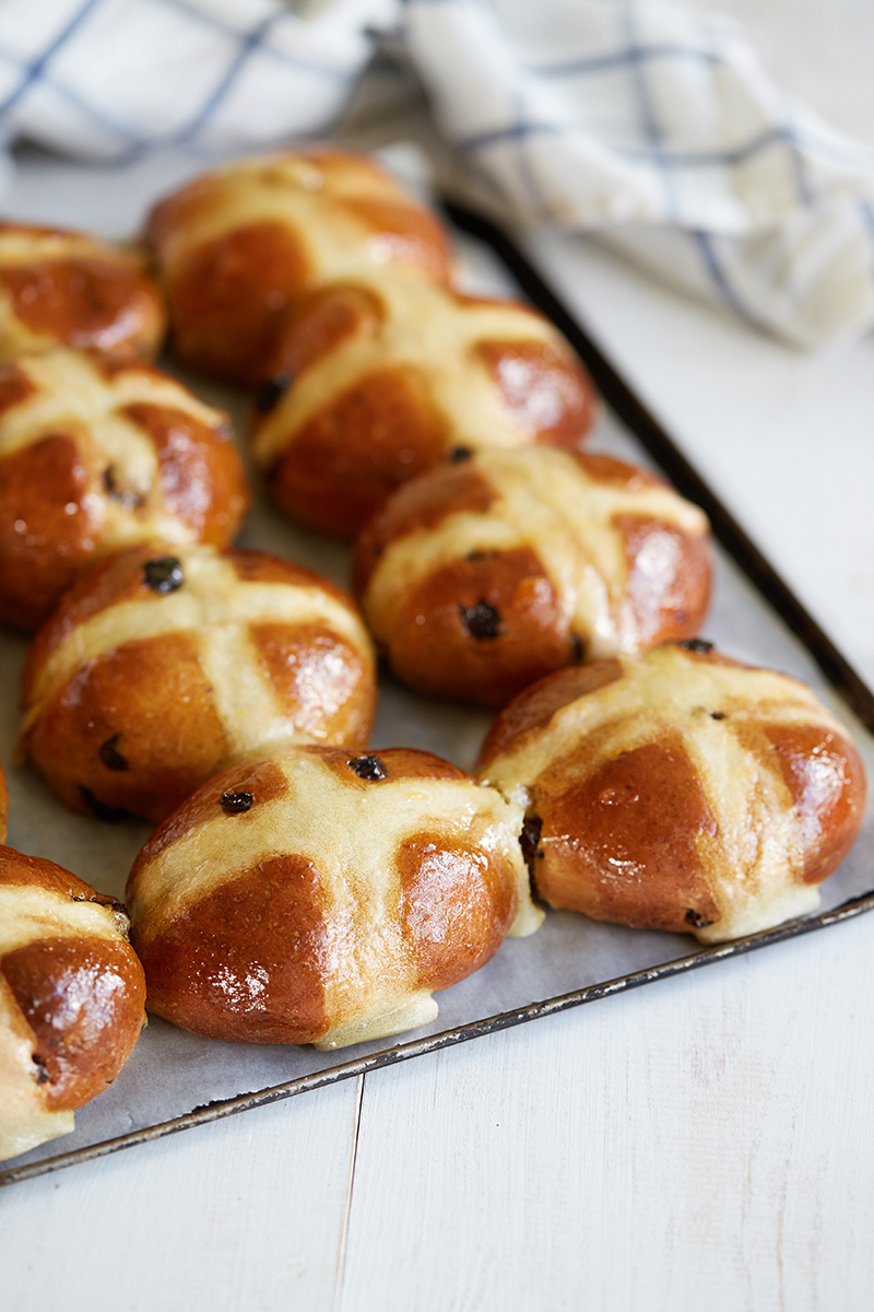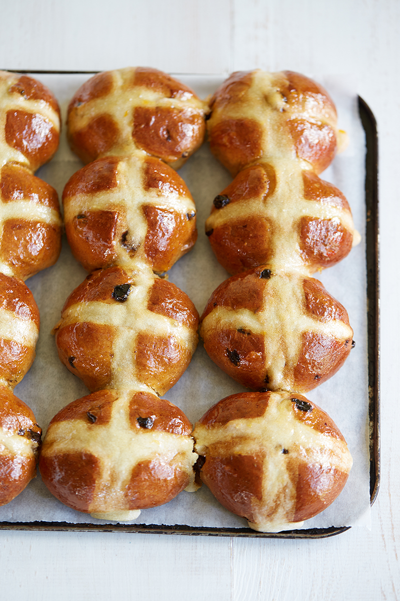 Divide and shape the dough into 12even buns, then line them up in rows ona parchment-lined baking tray, 2-3cm apart. Slash a cross into the top of each using a sharp, serrated knife; cutting in the same direction across each row of buns will make the piping easier. Cover with oiled cling film and leave to rise again until doubled in size, about 30 minutes. Preheat the oven to 180˚C, gas mark 4.